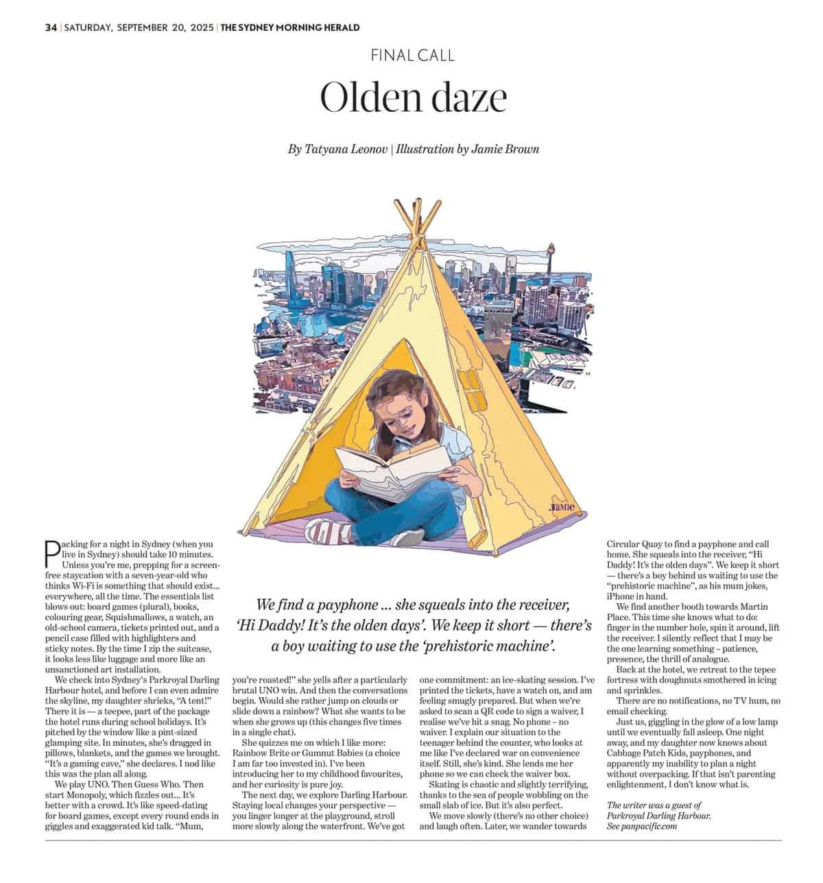 “We find a payphone ... she squeals into the receiver, ‘Hi Daddy! It’s the olden days’. We keep it short — there’s a boy waiting to use the ‘prehistoric machine’.”